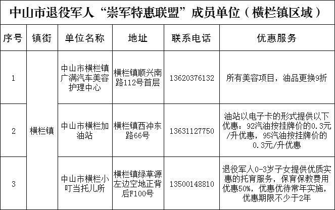 為貫徹落實(shí)習(xí)近平總書(shū)記關(guān)于退役軍人工作重要論述精神,加強(qiáng)退役軍人保障工作,我市決定組建中山市“崇軍特惠聯(lián)盟”。橫欄鎮(zhèn)迅速行動(dòng),以“讓退役軍人得實(shí)惠,讓軍人職業(yè)受尊崇”為宗旨,秉持“自愿參與、志愿服務(wù)、優(yōu)質(zhì)規(guī)范、合作共贏”原則,分批次招募聯(lián)盟成員單位,為廣大退役軍人提供價(jià)格優(yōu)惠產(chǎn)品、優(yōu)先優(yōu)待服務(wù)。12月2日,橫欄鎮(zhèn)首批3家“中山市退役軍人崇軍特惠聯(lián)盟”商家正式掛牌。 橫欄鎮(zhèn)副鎮(zhèn)長(zhǎng)程輝、鎮(zhèn)公共服務(wù)辦和鎮(zhèn)退役軍人服務(wù)中心等負(fù)責(zé)人分別到橫欄鎮(zhèn)廣滿汽車(chē)美容護(hù)理中心、橫欄加油站、橫欄小叮當(dāng)托兒所進(jìn)行授牌。 據(jù)橫欄鎮(zhèn)退役軍人服務(wù)中心負(fù)責(zé)人介紹,凡持有退役證或優(yōu)待證等有效證件的退役軍人,可到目前市內(nèi)102個(gè)“崇軍特惠聯(lián)盟”成員單位享受優(yōu)惠商品和服務(wù)。同時(shí),橫欄鎮(zhèn)將繼續(xù)探索擁軍優(yōu)撫新模式,吸引更多的企業(yè)、商家加入“崇軍特惠聯(lián)盟”,為退役軍人提供更多更好的服務(wù),增強(qiáng)軍人榮譽(yù)感、自豪感,努力營(yíng)造崇軍的良好社會(huì)氛圍,切實(shí)為退役軍人辦實(shí)事、辦好事、解難事,致敬“最可愛(ài)的人”。