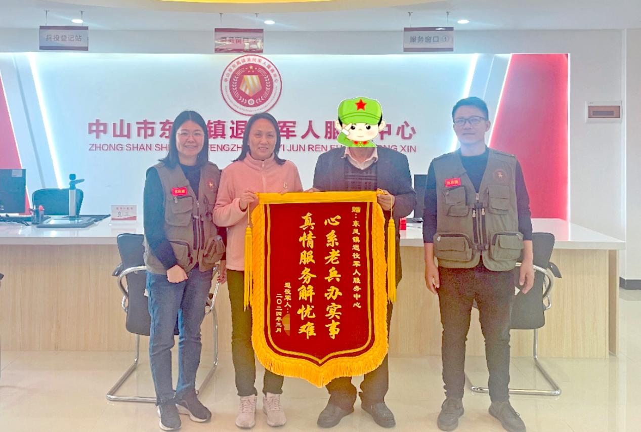 3月19日,中山市東鳳鎮(zhèn)小瀝社區(qū)退役軍人朱叔懷著感激之情,將一面印有“心系老兵辦實(shí)事,真情服務(wù)解憂難”的錦旗送到東鳳鎮(zhèn)退役軍人服務(wù)中心,感謝該中心幫助其分別成功申請(qǐng)到廣東省應(yīng)急救助資金和中山市臨時(shí)困難補(bǔ)助,解決了他的燃眉之急,緩解了家庭困難。  退役軍人朱叔將一面印有“心系老兵辦實(shí)事,真情服務(wù)解憂難”的錦旗送到東鳳鎮(zhèn)退役軍人服務(wù)中心。通訊員供圖